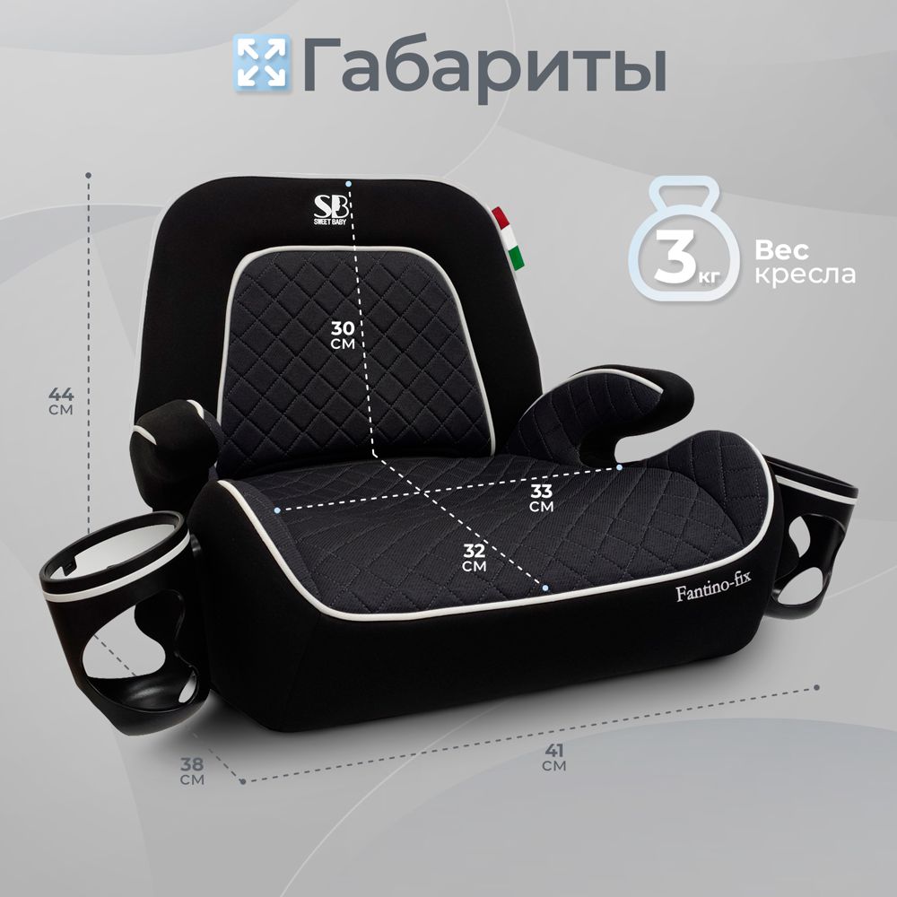 Детское автокресло Sweet Baby Fantino (Свитбэби Фантино) предназначено для перевозки детей весом от 15 до 36 кг и может быть установлено в автомобиле только по ходу движения. Бустер крепится с помощью совместимой с ISOFIX системы В-FIX, а для фиксации ребенка используются штатные 3-точечные ремни безопасности автомобиля.