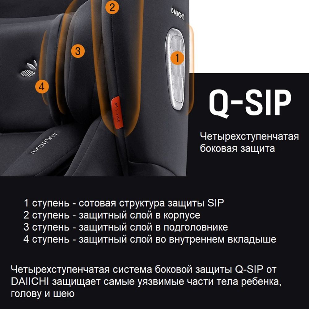 Daiichi All-in-One 360 i-Size (Дайичи Олл-ин-Уан 360 Айсайз) оборудовано фирменной системой защиты от боковых ударов Q-SIP, включающей 4 уровня защиты головы и шей юного пассажира. Кресло протестировано и успешно сертифицировано в соответствии с наиболее передовым европейским стандартом безопасности R-129 (i-Size).