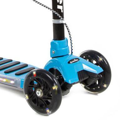 Складывается самокат одним движением с помощью фиксатора у основания рулевого рычага. Все колеса оборудованы светодиодами, начинающими светиться при вращении. Основание самоката имеет встроенную в боковины подсветку и музыкальное сопровождение, питаемое батарейкой, помещенной снизу в подножку.
