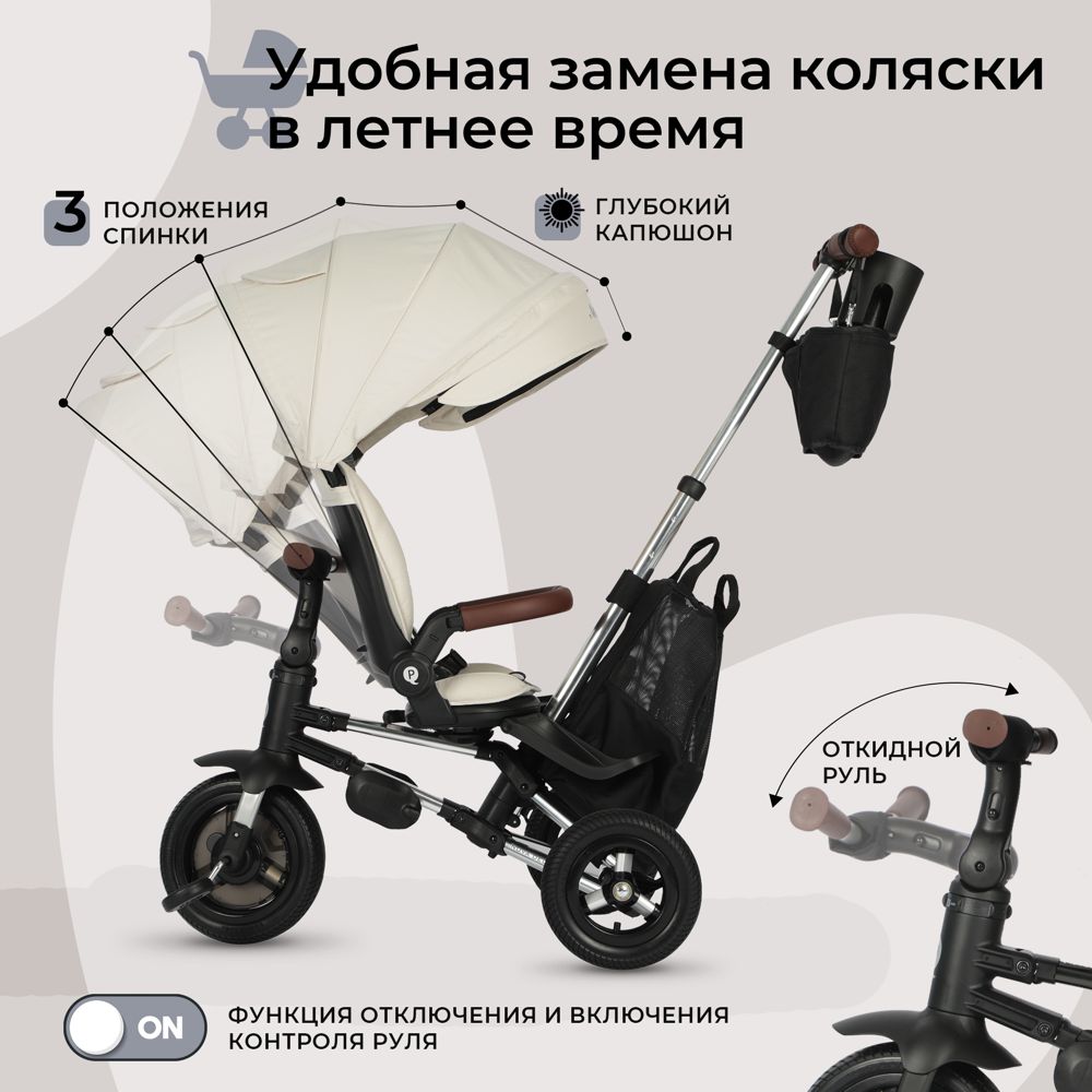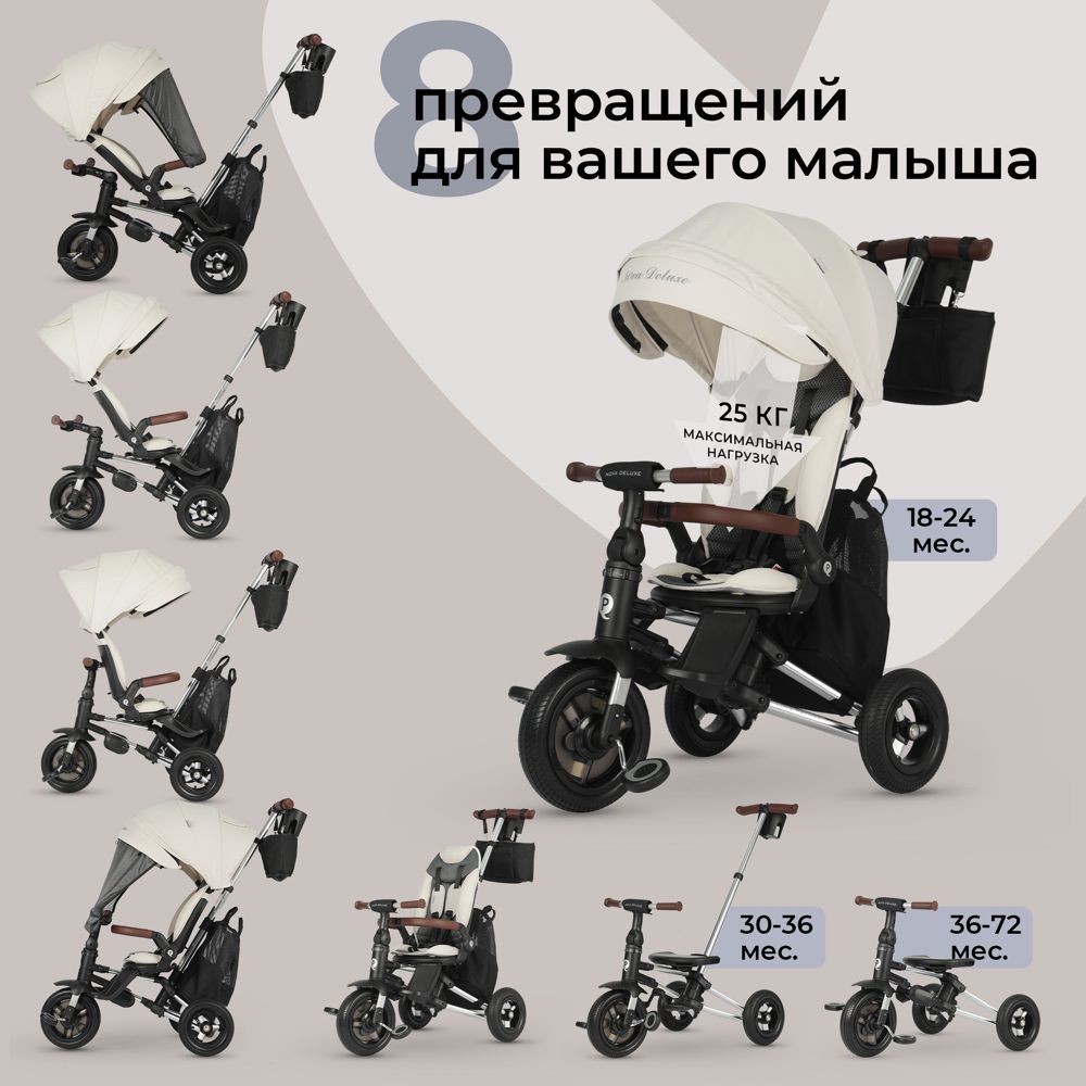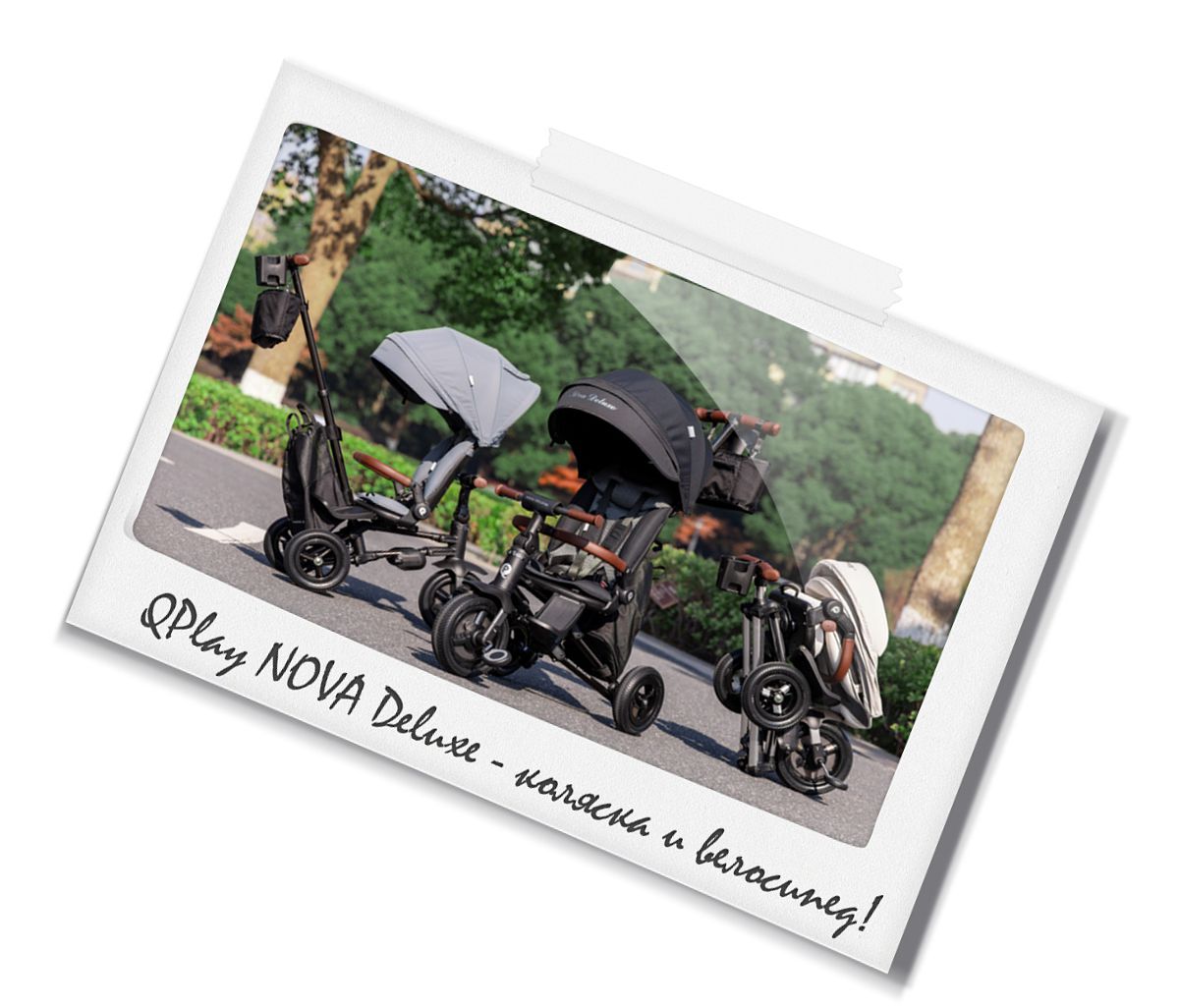 QPlay Nova Deluxe - премиум-версия популярного складного трехколесного велосипеда с функционалом компактной коляски. Велосипед оснащен родительской ручкой управления изменияемой длины, реверсивным сиденьем с возможностью наклона и защитным бампером, козырьком от солнца, 5-точечными ремнями и функциями свободного хода руля и переднего колеса, а для максимального комфорта колеса велосипеда сделаны пневматическими и в комплекте поставляются сумка-мешок для хранения, сумка для мелких вещей, подстаканник и подставка для смартфона, фиксируемые на родительской ручке.