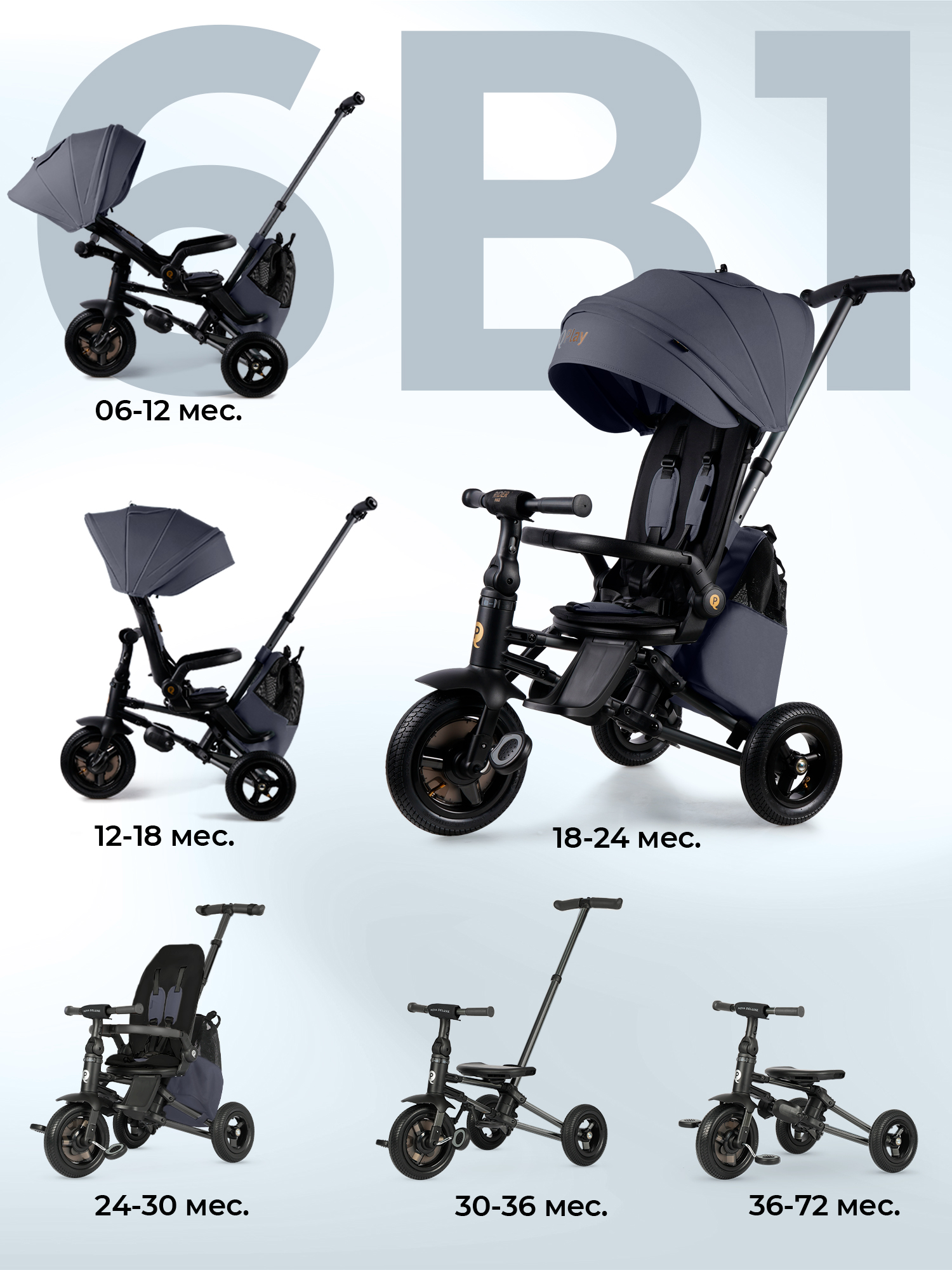 QPlay Sprinter Max S702 может иметь 6 различных конфигураций, применяемых по мере роста юного владельца, от первоначальной с полулежачим положением лицом к родителю для самых маленьких до сидячего положения с полноценным управлением и самостоятельным вращением педалей для самых старших. В комплекте поставляется съемный козырек со встроенным сетчатым смотровым окошком и вместительный рюкзак, который можно закрепить на родительскую ручку.