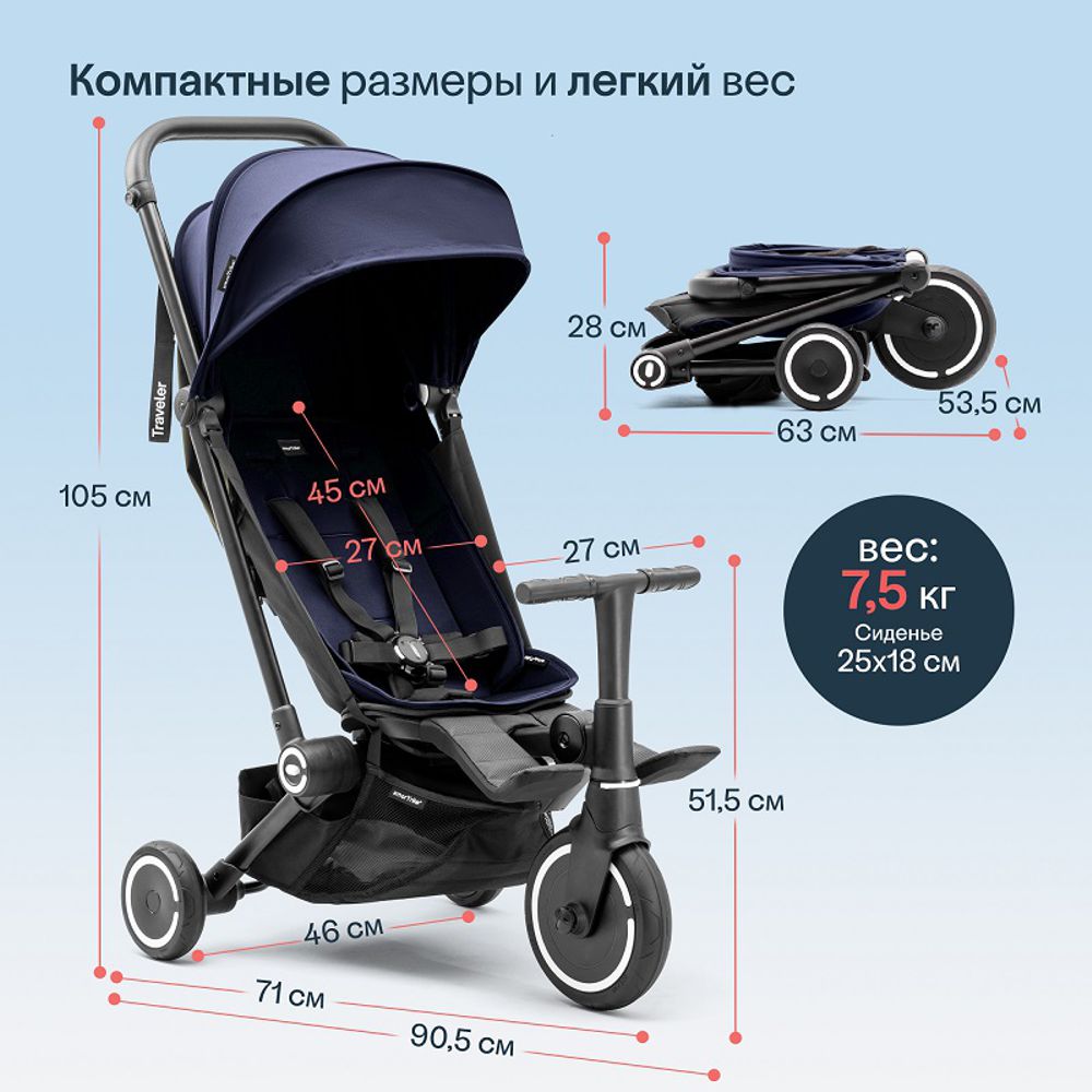 SmarTrike Traveler — уникальный трехколесный велосипед-коляска от одного из лидеров индустрии. Его можно легко трансформировать из коляски в велосипед для малышей. Главное преимущество — конструкция родительской ручки, аналогичная обычным коляскам. Это позволяет легко преодолевать бордюры и другие препятствия, а большое переднее колесо с поворотом на 360° дает возможность разворачиваться на месте. Сиденье трансформируется в практически горизонтальное ложе, делая велосипед удобным, как полноценная коляска. СмарТрайк Тревелер также компактно складывается, что удобно для путешествий, включая перелеты на самолете. Но самое главное, всё это не мешает оставаться SmarTrike Traveler отличным удобным велосипедом, позволяющим малышу кататься самостоятельно!