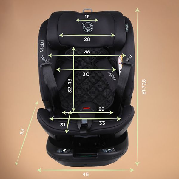 Универсальное автокресло для всех возрастов Kidzi Spin PLUS 360 i-Size (Кидзи Спин Плюс 360 Ай-сайз) разработано для комфортных поездок детей ростом от 40 до 150 см, что примерно соответствует возрасту с рождения и до 12 лет.