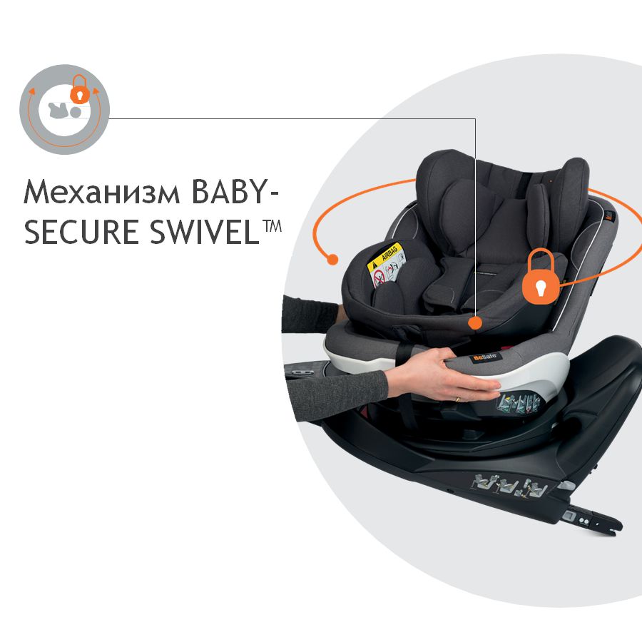 Механизм вращения на 360 градусов облегчает посадку и высадку ребенка, а благодаря вставке для новорожденных BABY SHELL™, оснащенной блокирующим механизмом BABY-SECURE SWIVEL™, при перевозке младенца автокресло невозможно ошибочно повернуть в положение по ходу движения.