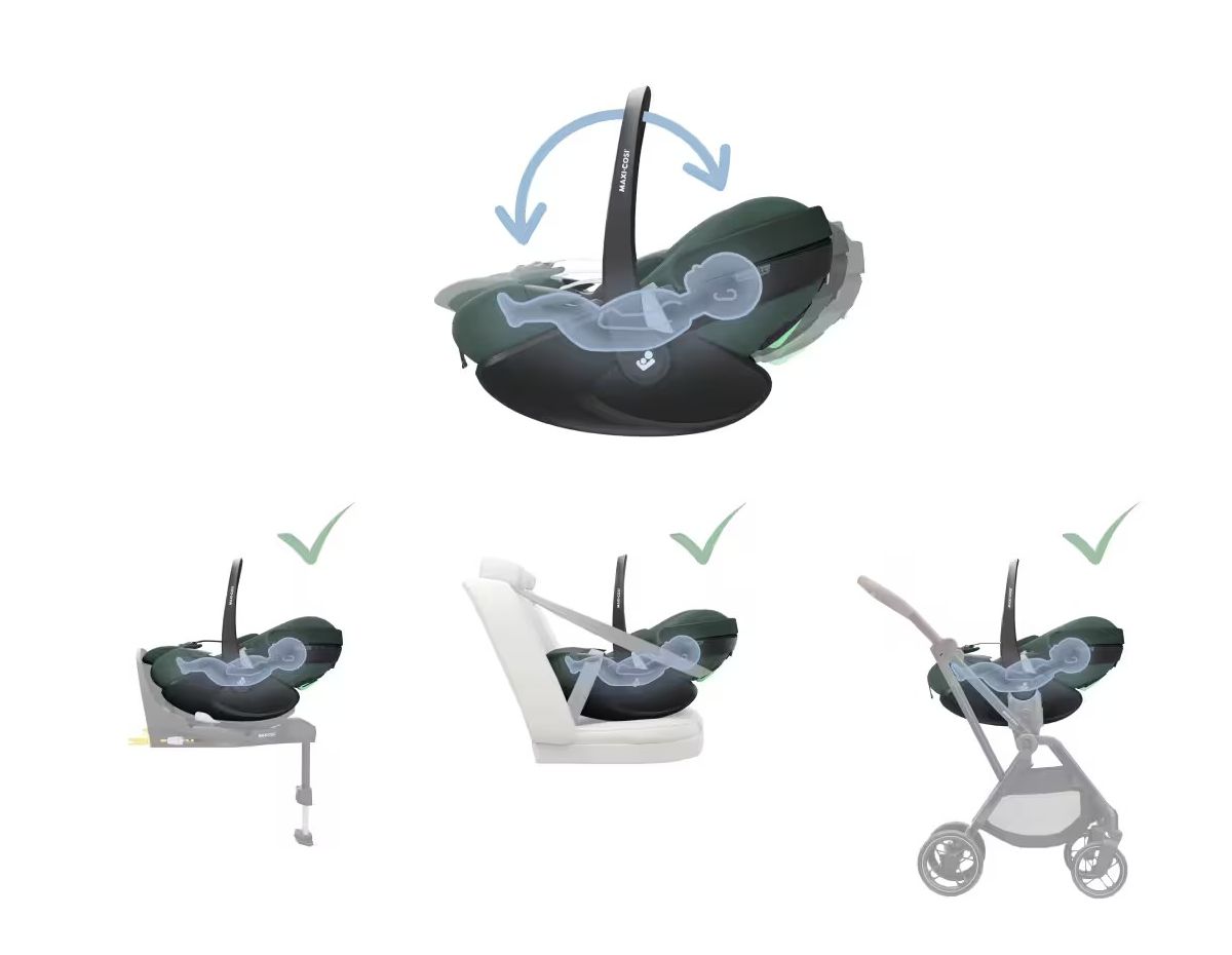 Для того, чтобы обеспечить наиболее естественное положение малыша, Pebble 360 Pro может откидываться в практически полностью лежачее положение во всех режимах – в автомобиле с базой FamilyFix 360 Pro или без нее, а также на шасси коляски.