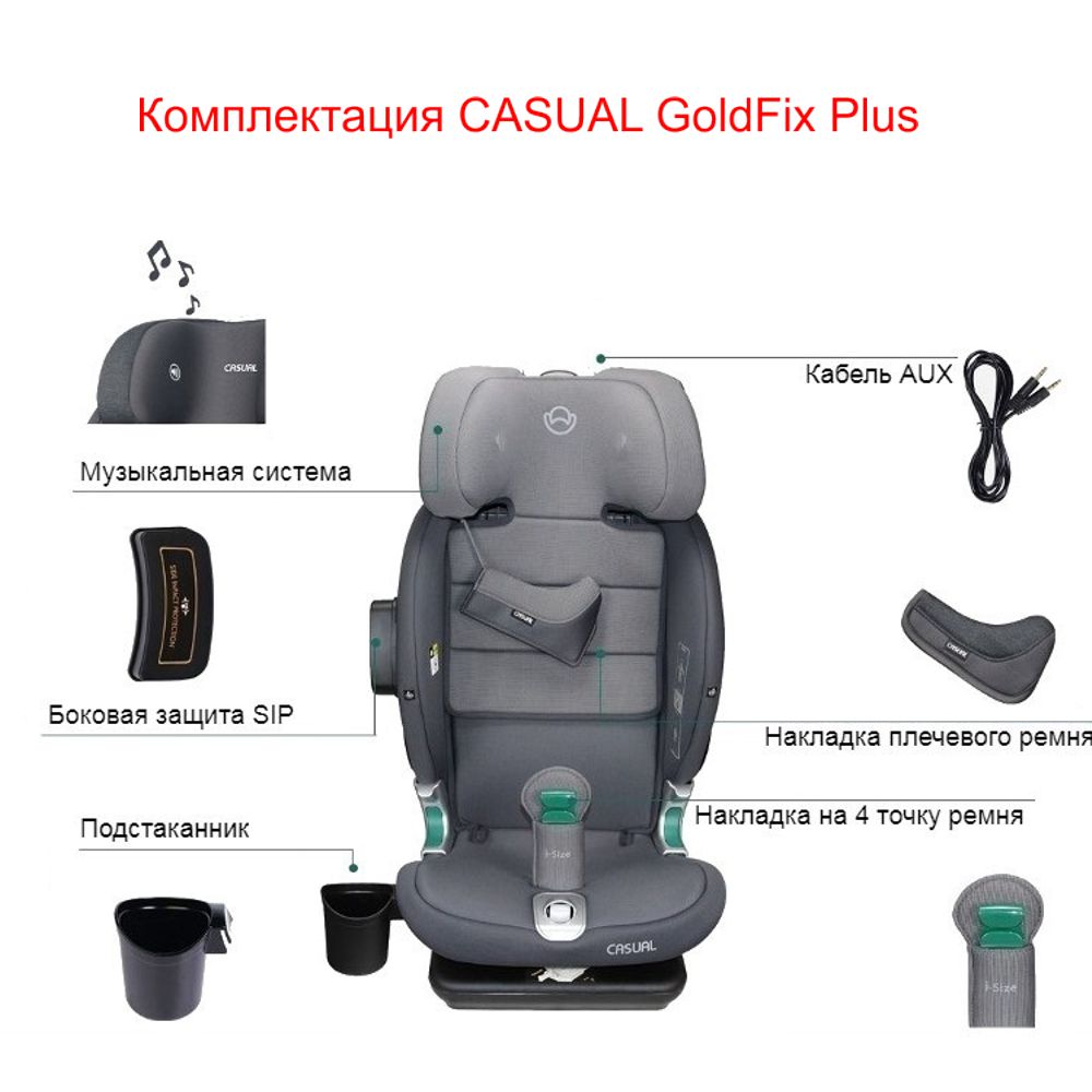 Новинка сезона 2023, универсальное автокресло для детей 1-12 лет от турецкого бренда CASUAL Goldfix Plus i-Size предлагает топовую комплектацию серии Goldfix, включающую такие дополнительные аксессуары, как съемный подстаканник, встроенные в подголовник стереодинамики и дополнительную накладку Safe Pad на штатный ремень безопасности. Кресло также имеет надежный ударопрочный каркас, просторную чашу и широкий диапазон регулировки наклона. В конструкции CASUAL Goldfix Plus i-Size применяется пена с памятью, внутренние ремни с противоскользящими накладками и возможностью быстрого складывания в специальные ниши в корпусе, дополнительные энергопоглощающие элементы SIP и 4 точка крепления ремня для детей постарше. Достойный уровень безопасности детского сиденья подтверждает сертификация в соответствии с передовым европейским стандартом безопасности R-129/3 (i-Size) и результаты краш-тестов, проведенных на реальных образцах.