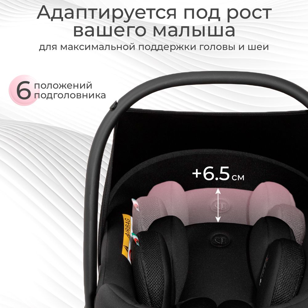 Подголовник с внутренними ремнями можно регулировать по высоте в диапазоне до 65 мм! Это позволяет адаптировать автолюльку под рост ребенка и надежно поддерживать его голову и шею.
